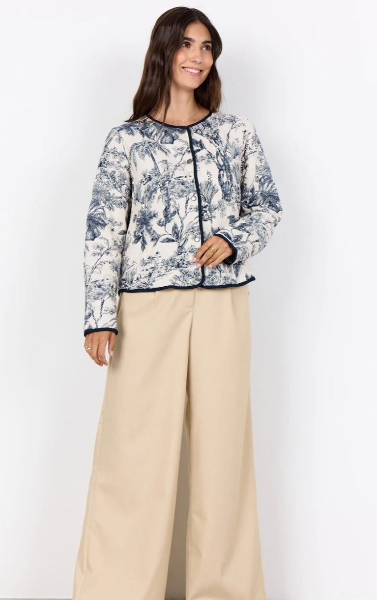 The Soya Concept Jacket is a beautifully patterned jacket made from 100% LENZING™ ECOVERO™ Viscose. It includes a round neckline, front buttons, and a striking botanical print with a quilted texture and striped edging. Pair it with dark jeans for an elegant look or with a simple skirt for a unique twist.