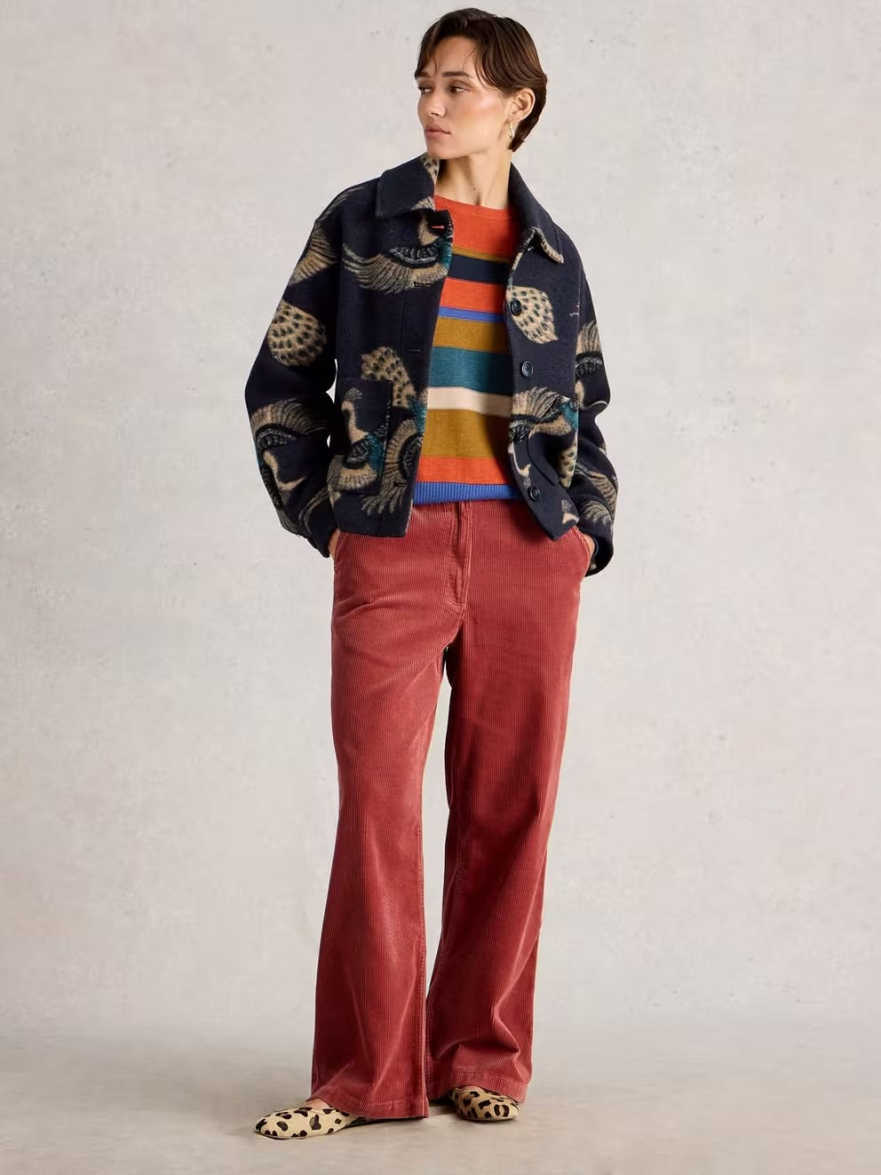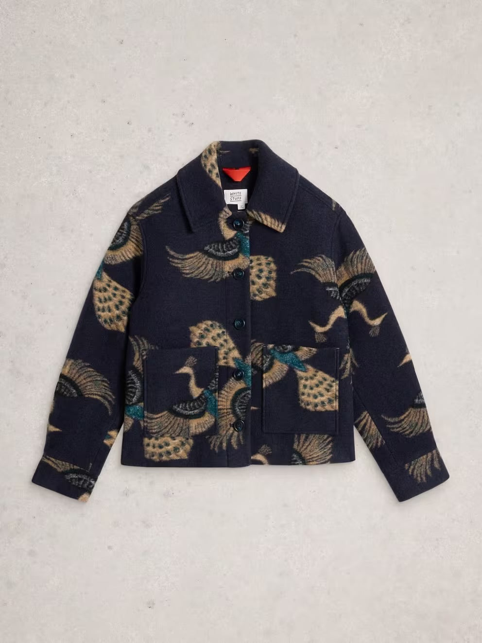 Think outside the box. And you'll find a boxy White Stuff wool blend jacket. Slightly cropped to the hip with front patch pockets. (The print's pretty fun too.)