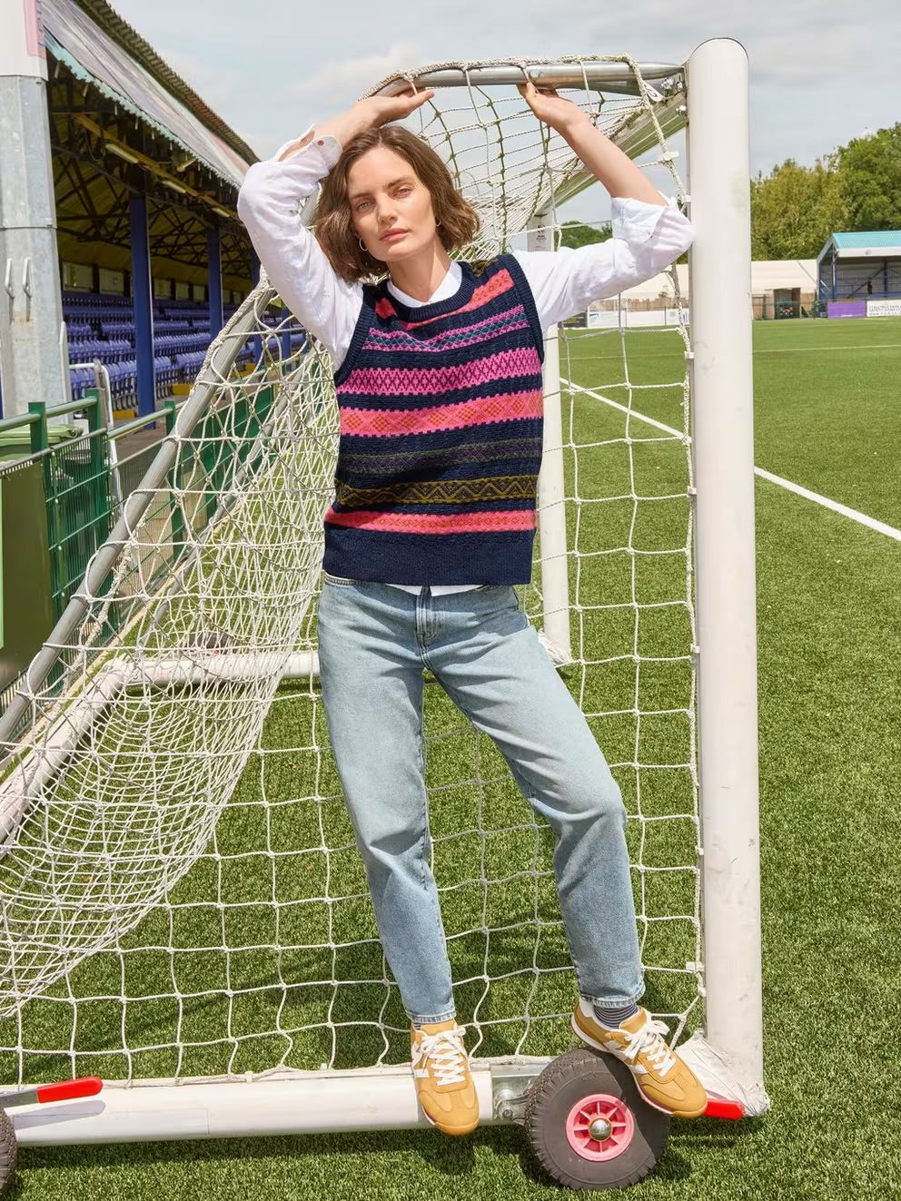 Do the bright thing and make this knitted tank your own. Style it with a white tee underneath, easy denim jeans, and ankle boots.